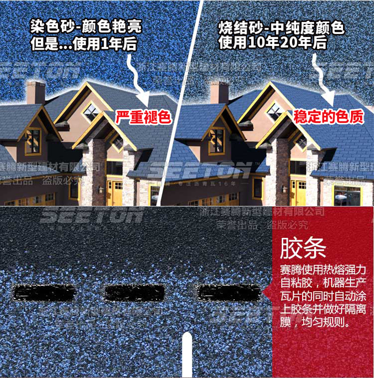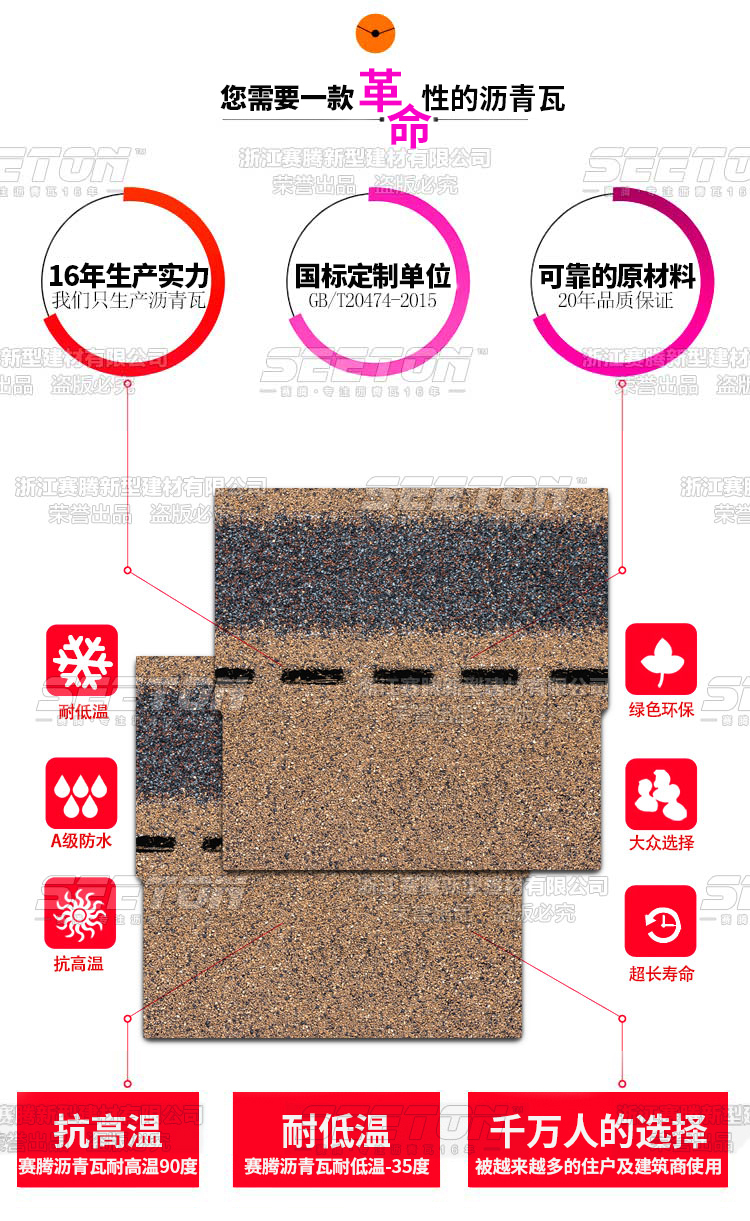 常規(guī)單層標(biāo)準(zhǔn)型瀝青瓦采用三垂片設(shè)計(jì),再配以特有的賽騰跳色技術(shù),大大增強(qiáng)單層瓦的美觀程度,層次感立體感將你帶入一個(gè)全新的視覺盛宴。 使用年限:20年 執(zhí)行標(biāo)準(zhǔn):GB/T20747-2015