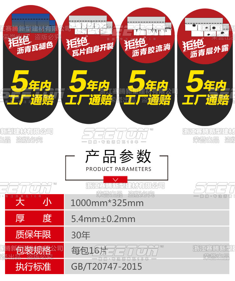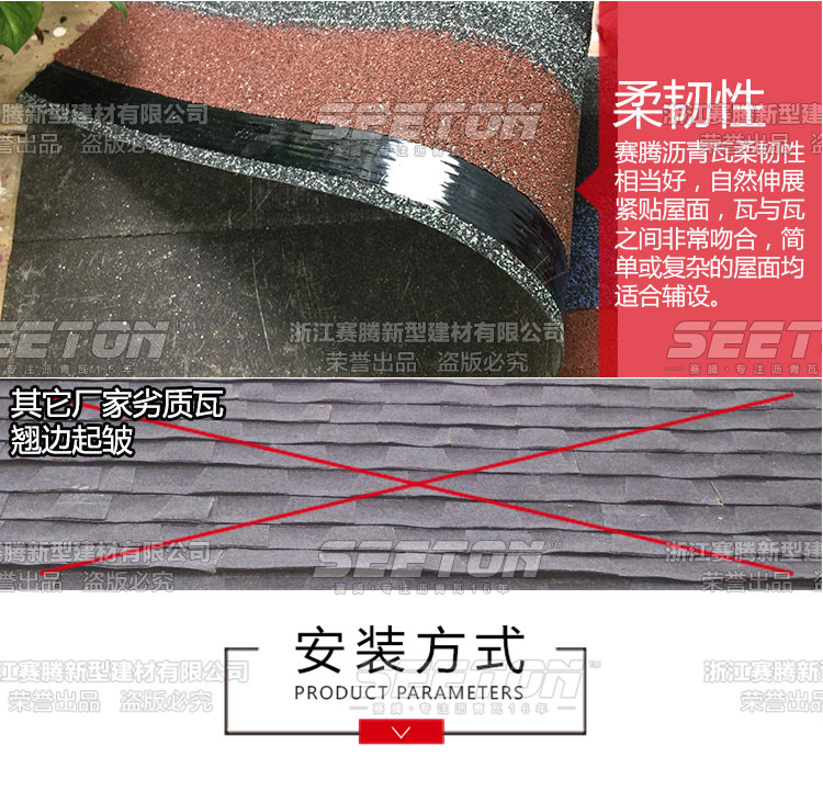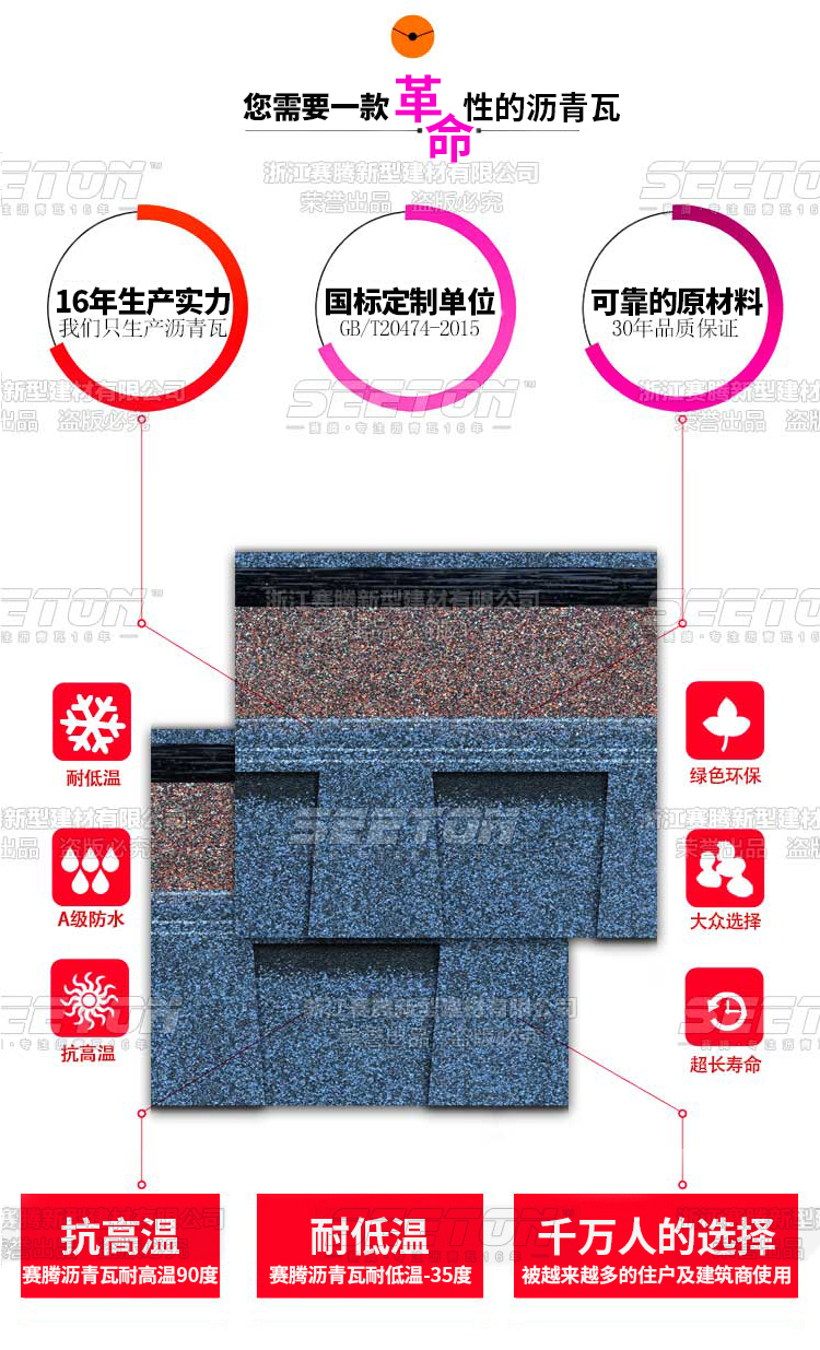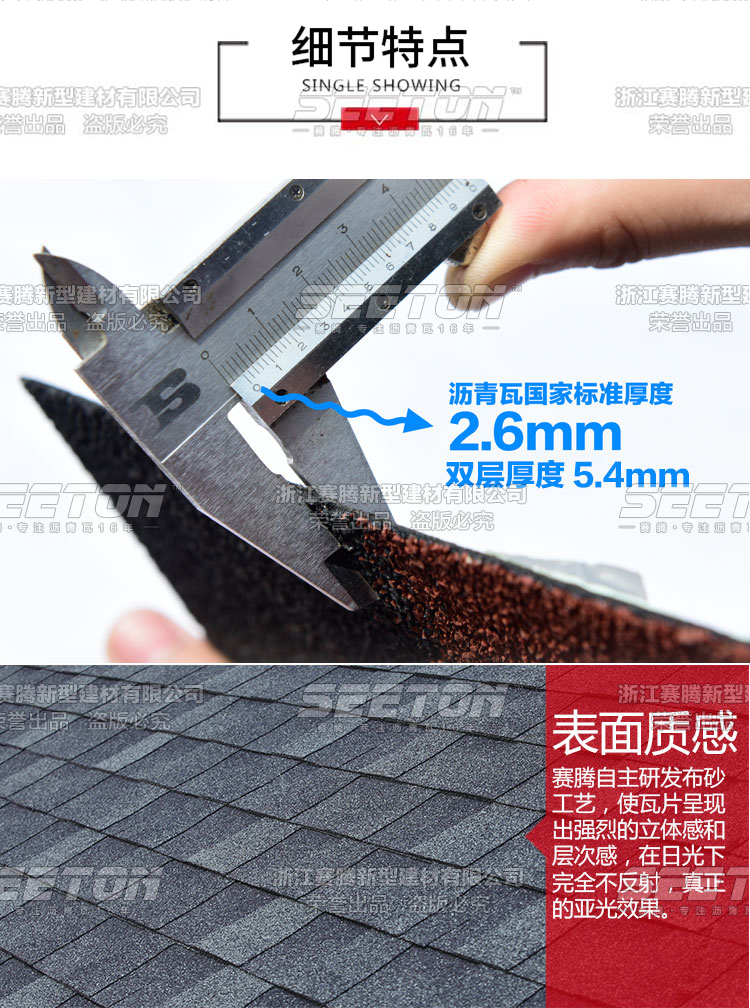 疊層瓦的嶄新技術(shù)使傳統(tǒng)的屋頂煥然一新,不規(guī)則的外形和顏色創(chuàng)造出美麗的浮雕效果,體現(xiàn)出莊嚴(yán)厚重的王者風(fēng)范。 使用年限:30年 執(zhí)行標(biāo)準(zhǔn):GB/T20747-2015
